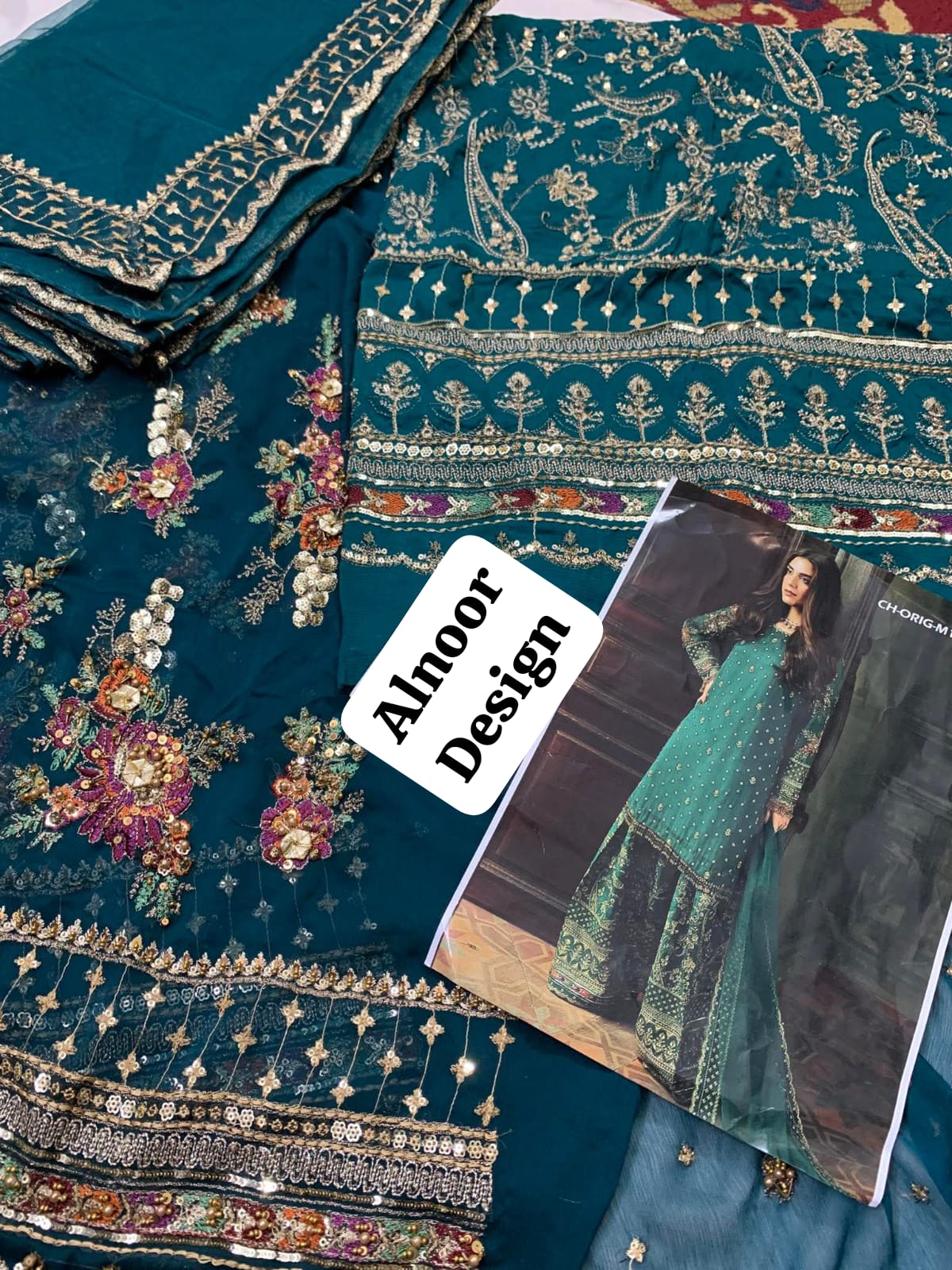 This is a Charizma Dastan-e-Jashan Luxury Chiffon Unstitched 3-piece suit in teal, featuring extensive embroidery and adda work.