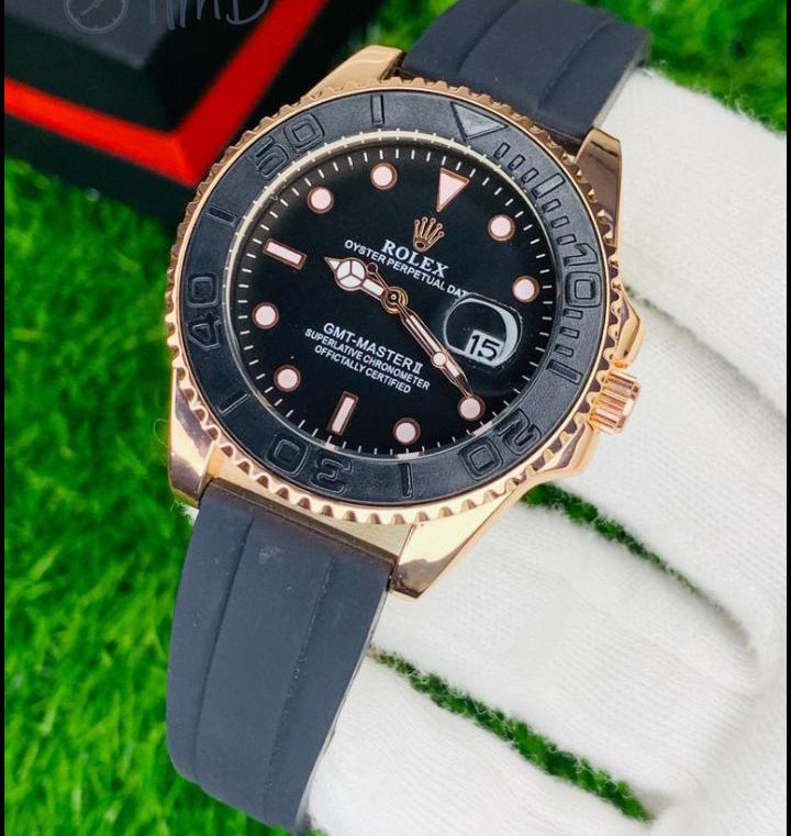 This is a Rolex Yacht-Master watch with an 18k yellow gold case, black dial, and a black Oysterflex rubber bracelet.